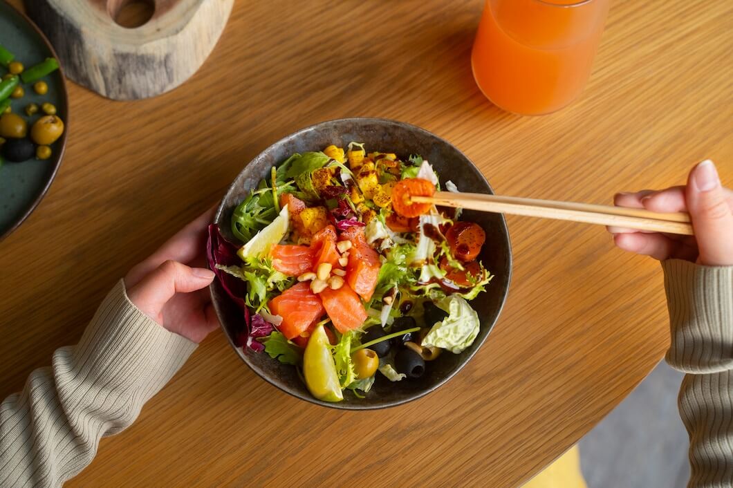 출처 <a href="https://kr.freepik.com/free-photo/top-view-woman-eating-salmon-bowl_43218793.htm"> Freepik </a>