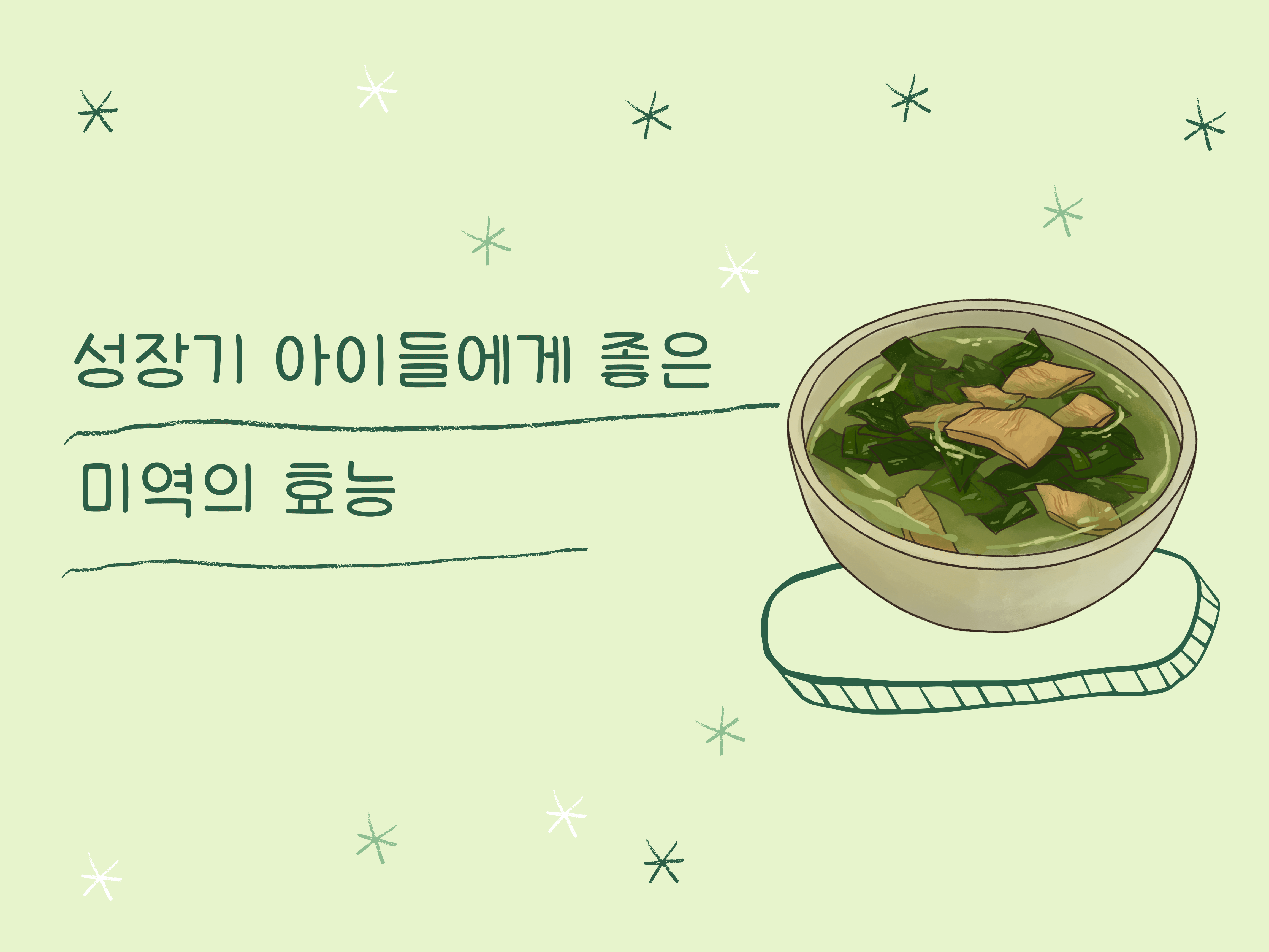 미역에 들어있는 요오드는 성장 발육을 촉진시키는 갑상선 호르몬의 원료로 성장기 아이들에게 아주 좋은 음식입니다.